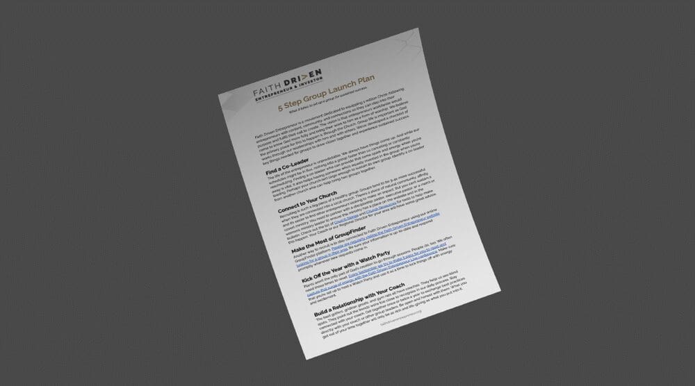 We want to help you spread the word about your Faith Driven Entrepreneur Group. Scan through the resources below, click to download, and share with your church, friends, and network. If you need any help launching, don’t hesitate to reach out to us to find best practices on how other churches are launching their groups. Not sure where to start? The most successful groups follow our 5 Step Launch Guide. Download that one-page document below.