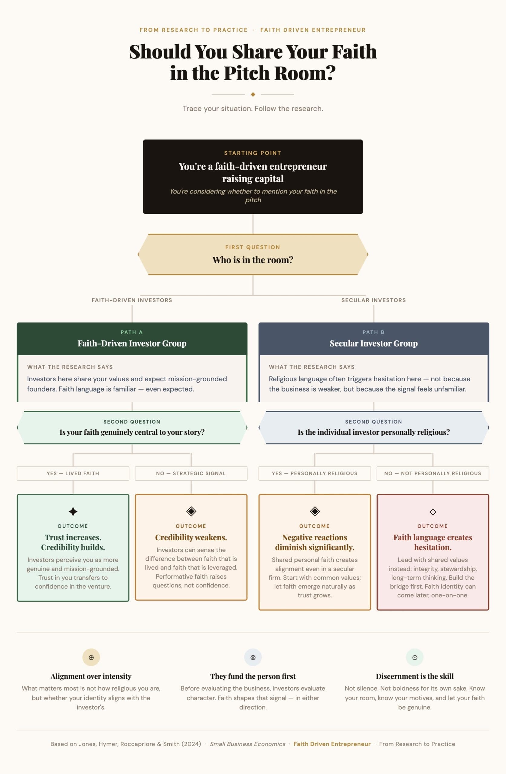 A 2024 study published in Small Business Economics looked at exactly this question: does religious language in a startup pitch help or hurt investor confidence? Researchers Jessica Jones, Christian Hymer, Ashley Roccapriore, and Brett Smith ran controlled experiments with both faith-driven and secular angel investor groups. Participants evaluated near-identical pitches, some with faith-based mission statements and some without, and shared how those statements shaped their perception of the founder and the venture.